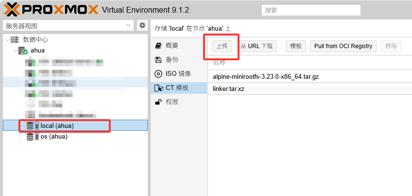1、下载镜像包,上传到PVE镜像目录中的CT模板中