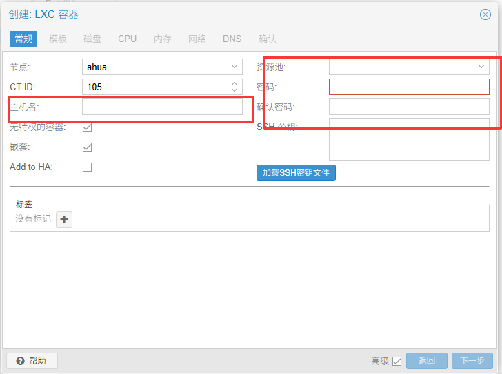 3、主机名和密码 按需填写 建议用默认无特权容器