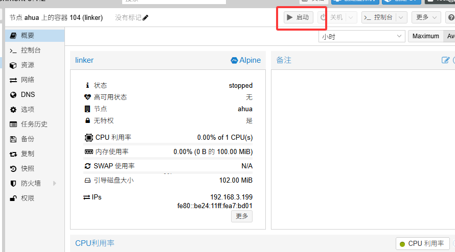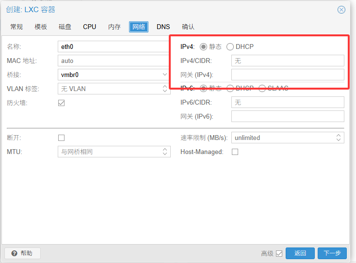 5、磁盘、CPU、内存 按需填写 100MB磁盘和运存基本就够了 网络需要写路由器内外IP或者使用DHCP 不填写是没有IP的